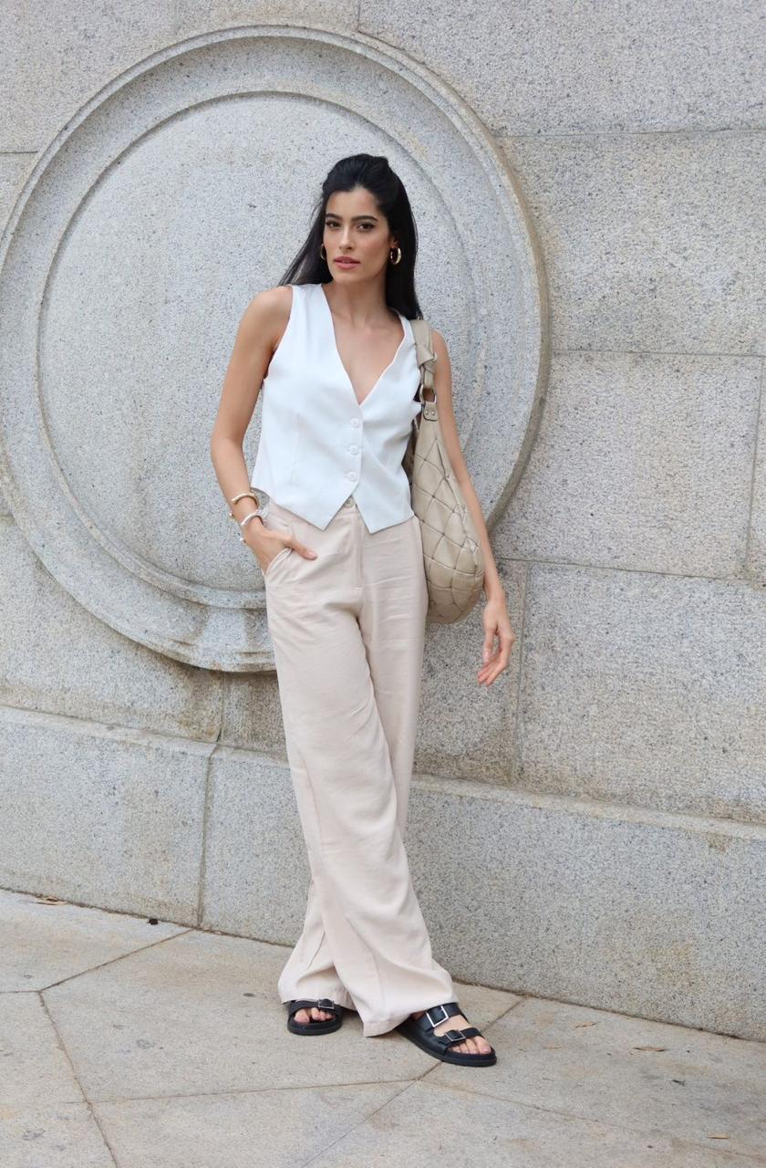 calça reta de alfaiataria com caimento fluido , possui fechamento de botão e cós anatômico P veste 38